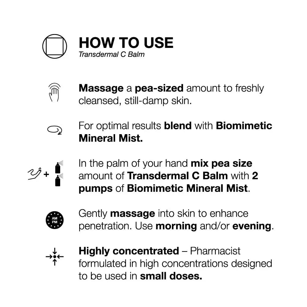 In the palm of your hand, mix a pea-sized amount of Transdermal C Balm and 2 pumps of Biomimetic Mineral Mist. Gently massage to enhance penetration.