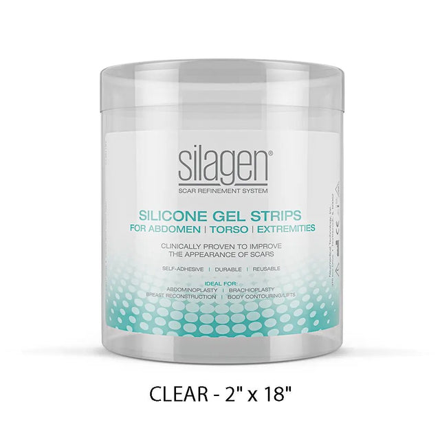 The Silagen Silicone Gel Sheeting Strip measures 2″ tall x 18″ wide, with one clear strip included per box.